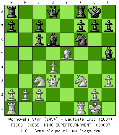 Last move : 1-0 2020 June 6 5:33:41 [Event "FICGS__CHESS__KING_SUPERTOURNAMENT__000007"] [Site "FICGS"] [Date "2020.04.16"] [Round "1"] [White "Wojnowski,Stan"] [Black "Bautista,Eric"] [Result "1-0"] [WhiteElo "1454"] [BlackElo "1630"] 1.e4 e5 2.f4 exf4 3.Nf3 Nc6 4.Bc4 d6 5.O-O Bg4 6.d4 Nf6 7.Bxf4 Be7 8.Nc3 Na5 9.Bd3 Nc6 10.Bb5 O-O 11.h3 Bh5 12.Bxc6 bxc6 13.e5 dxe5 14.Bxe5 Bd6 15.Qd3 1-0 King's knight's gambit Kingside Castling by player White (move 5) Kingside Castling by player Black (move 10) Player White won this chess game. Follow this game move after move (download)Chess holds its master in its own bonds, shackling the mind and brain so that the inner freedom of the very strongest must suffer. (Albert Einstein) Wie kann ich Remis annehmen? Ich weiß ja gar nicht, wie ich stehe! (Fritz Sämisch) Haz el enroque temprano y seguido. (Rob Sillars) Vous n'êtes pas toujours obligé de jouer le meilleur coup. Un coup doit être actif, entreprenant, correct et beau ! (David Bronstein) Whatever you do, don't be bored. This is absolutely the most exciting time we could have possibly hoped to be alive. And things are just starting. (From movie Waking life)