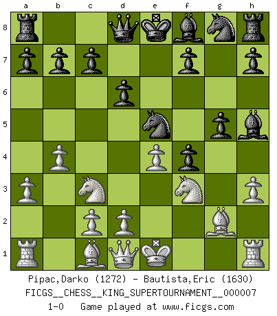 Last move : 1-0 2020 June 17 23:46:33 [Event "FICGS__CHESS__KING_SUPERTOURNAMENT__000007"] [Site "FICGS"] [Date "2020.04.16"] [Round "1"] [White "Pipac,Darko"] [Black "Bautista,Eric"] [Result "1-0"] [WhiteElo "1272"] [BlackElo "1630"] 1.e4 e5 2.f4 exf4 3.Nf3 g5 4.g4 d6 5.Nc3 Bxg4 6.Bg2 Nc6 7.a3 Ne5 8.h3 Bh5 9.b4 1-0 This chess game has been lost on time (started : 2020.04.16 16:9:28) King's knight's gambit Player White won this chess game. Follow this game move after move (download)Best by test: 1. e4 (Bobby Fischer) Ein unbeabsichtigtes Patt ist der Gipfel der Dummheit. (Anonymous) El poder defensivo de una pieza clavada, solamente es imaginario. (Aaron Nimzovich) Il a essayé de se convaincre qu'il pourrait empêcher toutes les erreurs et ne jamais perdre. L'horreur ! Gary Kasparov au sujet de Robert Fischer. Don't be discouraged. It's often the last key in the bunch that opens the lock. (Author unknown)