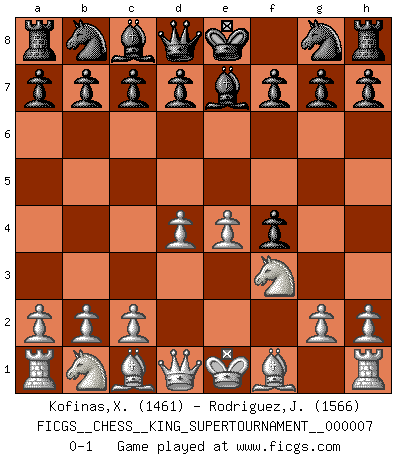 Last move : 0-1 2020 May 21 22:45:10 [Event "FICGS__CHESS__KING_SUPERTOURNAMENT__000007"] [Site "FICGS"] [Date "2020.04.16"] [Round "1"] [White "Kofinas,Xristos"] [Black "Rodriguez,Juan Antonio"] [Result "0-1"] [WhiteElo "1461"] [BlackElo "1566"] 1.e4 e5 2.f4 exf4 3.Nf3 Bc5 4.d4 Be7 0-1 This chess game has been lost on time (started : 2020.04.16 16:9:28) King's knight's gambit Player Black won this chess game. Follow this game move after move (download)A bad plan is better than none at all. (Frank Marshall) Alles was am Schachbrett zählt sind gute Züge. (Robert James Fischer) El arma más poderosa en el Ajedrez, es tener la próxima movida. (David Bronstein) Les Echecs sont et restent toujours un combat, un combat intégral comme la boxe, la lutte ou un autre sport, et où il doit y avoir un vainqueur et un vaincu. (Joseph Emil Diemer) May I never be complete. May I never be content. May I never be perfect. Deliver me, Tyler, from being perfect and complete. (Chuck Palahniuk, Fight Club)