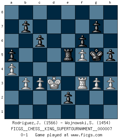 Last move : 0-1 2020 May 23 23:38:20 [Event "FICGS__CHESS__KING_SUPERTOURNAMENT__000007"] [Site "FICGS"] [Date "2020.04.16"] [Round "1"] [White "Rodriguez,Juan Antonio"] [Black "Wojnowski,Stan"] [Result "0-1"] [WhiteElo "1566"] [BlackElo "1454"] 1.e4 e5 2.f4 d5 3.d3 Nc6 4.Nf3 dxe4 5.dxe4 Qxd1+ 6.Kxd1 Bg4 7.Be2 O-O-O 8.Ke1 Bxf3 9.Bxf3 Nd4 10.Bd1 Nf6 11.c3 Ne6 12.f5 Nf4 13.Bxf4 exf4 14.Bf3 Bc5 15.Nd2 Be3 16.Nc4 Rhe8 17.Nxe3 fxe3 18.Rd1 Rxd1+ 19.Kxd1 Nxe4 20.Bxe4 Rxe4 21.Ke2 Kd7 22.g3 Ke7 23.Rd1 Kf6 24.Rf1 Kg5 25.h3 h5 26.Kd3 Re8 27.Ke2 Re5 28.Rf3 f6 29.a4 a5 30.b3 c6 31.Kd3 e2 0-1 KGD : Falkbeer counter-gambit Queenside Castling by player Black (move 7) Player Black won this chess game. Follow this game move after move (download)One bad move nullifies forty good ones. (Horowitz) Der beste Spieler in einem Turnier gewinnt es nie. Er landet auf Platz zwei oder drei. (Siegbert Tarrasch) Buenas posiciones no logran ganar juegos, buenas movidas sí. (Gerald Abrahams) Les échecs, c'est l'art d'analyser. (Mikhail Botvinnik) They say in chess you've got to kill the queen, and then you mate it... Oh I, do you ? (Red Hot Chili Peppers, Fortune faded)