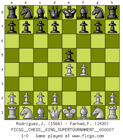 Last move : 1-0 2020 May 17 2:29:2 [Event "FICGS__CHESS__KING_SUPERTOURNAMENT__000007"] [Site "FICGS"] [Date "2020.04.16"] [Round "1"] [White "Rodriguez,Juan Antonio"] [Black "Farhad,Farhadi"] [Result "1-0"] [WhiteElo "1566"] [BlackElo "1430"] 1.e4 e5 2.f4 1-0 This chess game has been lost on time (started : 2020.04.16 16:9:28) King's gambit Player White won this chess game. Follow this game move after move (download)Via the squares on the chessboard, the Indians explain the movement of time and the age, the higher influences which control the world and the ties which link Chess with the human soul. (Al-Masudi) Schach ist ein schwarz-weisser Dschungel. (Garry Kasparov) Tu cuerpo tiene que estar en óptima condición. Tu Ajedrez se deteriora como lo hace tu cuerpo. No puedes separar la mente y el cuerpo. (Bobby Fischer) Les sacrifices démontrent seulement que quelqu'un a gaffé. (Savielly Tartacover) It is the aim of the modern school, not to treat every position according to one general law, but according to the principle inherent in the position. (Richard Reti)