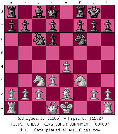 Last move : 1-0 2020 May 27 23:49:38 [Event "FICGS__CHESS__KING_SUPERTOURNAMENT__000007"] [Site "FICGS"] [Date "2020.04.16"] [Round "1"] [White "Rodriguez,Juan Antonio"] [Black "Pipac,Darko"] [Result "1-0"] [WhiteElo "1566"] [BlackElo "1272"] 1.e4 e5 2.f4 exf4 3.Nf3 Nf6 4.d3 Nc6 5.Bxf4 Bd6 6.Bxd6 cxd6 7.Nc3 O-O 8.Be2 1-0 This chess game has been lost on time (started : 2020.04.16 16:9:28) KGA : Schallop defense Kingside Castling by player Black (move 7) Player White won this chess game. Follow this game move after move (download)Chess opens and enriches your mind. (Saudin Robovic) Ich weiss nicht was Gott gegen mich auf 1.e4 antworten würde. (Robert James Fischer) El Ajedrez es despiadado: debes de estar preparado para matar gente. (Nigel Short) Des combinaisons [dans le jeu d'échecs] pareilles à des mélodies. Je crois entendre pour ainsi dire la musique des coups... (Vladimir Nabokov) Nobody is always a winner, and anybody who says he is, is either a liar or doesn't play poker. (Amarillo Slim)