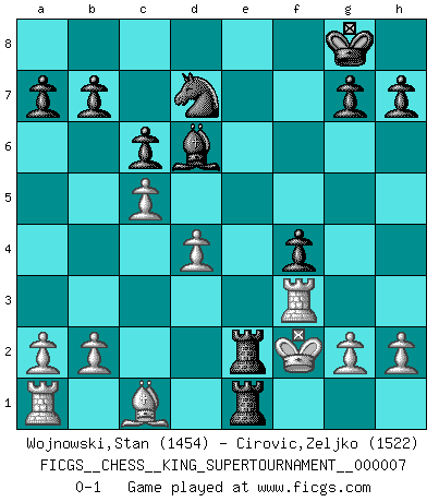 Last move : 0-1 2020 May 4 18:8:49 [Event "FICGS__CHESS__KING_SUPERTOURNAMENT__000007"] [Site "FICGS"] [Date "2020.04.16"] [Round "1"] [White "Wojnowski,Stan"] [Black "Cirovic,Zeljko"] [Result "0-1"] [WhiteElo "1454"] [BlackElo "1522"] 1.e4 e5 2.f4 exf4 3.Nf3 d5 4.e5 Bg4 5.Be2 Bxf3 6.Bxf3 Qh4+ 7.Kf1 c6 8.d4 f6 9.exf6 Nxf6 10.Qe1+ Qxe1+ 11.Kxe1 Bd6 12.Kf2 O-O 13.Nc3 Nbd7 14.Rf1 Rae8 15.Kg1 Ne4 16.Nxe4 dxe4 17.c4 exf3 18.Rxf3 Re1+ 19.Kf2 Rfe8 20.c5 R8e2+ 0-1 KGA : Abbazia defense (Classical defense, Modern defense!) Kingside Castling by player Black (move 12) Player Black won this chess game. Follow this game move after move (download)Chess is played with the mind and not with the hands ! (Renaud and Kahn) Das Blackmar-Diemer-Gambit verändert den ganzen Menschen! (Emil Joseph Diemer) Cualquier cambio de material en una posición debe venir por medio de un mate, una captura o promoción de Peón. (Purdy) Le plus grand jeu de l'esprit jamais inventé, plus vous l'apprenez, plus vous y prenez du plaisir. (Garry Kasparov) Life is verb, not a noun. (Charlotte Perkins Gilman)