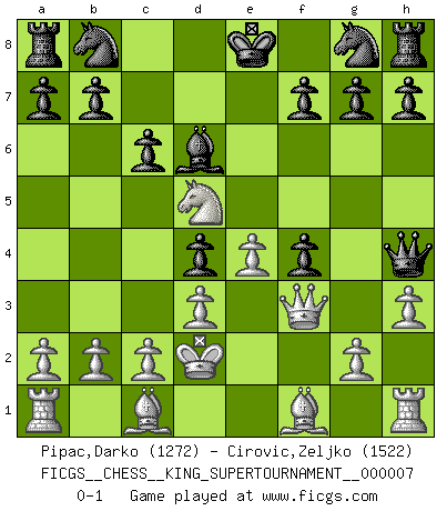 Last move : 0-1 2020 May 27 10:36:40 [Event "FICGS__CHESS__KING_SUPERTOURNAMENT__000007"] [Site "FICGS"] [Date "2020.04.16"] [Round "1"] [White "Pipac,Darko"] [Black "Cirovic,Zeljko"] [Result "0-1"] [WhiteElo "1272"] [BlackElo "1522"] 1.e4 e5 2.f4 exf4 3.Nf3 d5 4.d3 Bg4 5.h3 Bxf3 6.Qxf3 Qh4+ 7.Kd2 Bd6 8.Nc3 d4 9.Nd5 c6 0-1 This chess game has been lost on time (started : 2020.04.16 16:9:28) KGA : Abbazia defense (Classical defense, Modern defense!) Player Black won this chess game. Follow this game move after move (download)Adequate compensation for a sacrifice is having a sound combination leading to a winning position; adequate compensation for a blunder is having your opponent snatch defeat from the jaws of victory. (Bruce A. Moon) Es liegt in der Natur, vernüftig zu denken und unlogisch zu handeln. (Anatole France) Una mala movida nulifica cuarenta buenas. (Horowitz) Le profane ne songe pas à la somme de jouissance dont il se prive, qui méconnaît ce jeu aux ressources aussi variées que passionnantes. (Jean-Marie Jeanton-Lamarche) Two beer, or not two beer. (Unknown)