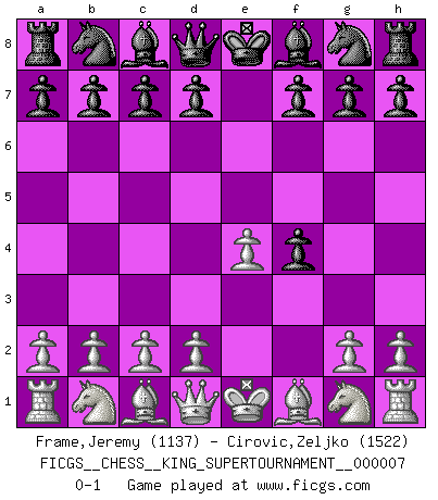 Last move : 0-1 2020 May 17 2:29:2 [Event "FICGS__CHESS__KING_SUPERTOURNAMENT__000007"] [Site "FICGS"] [Date "2020.04.16"] [Round "1"] [White "Frame,Jeremy"] [Black "Cirovic,Zeljko"] [Result "0-1"] [WhiteElo "1137"] [BlackElo "1522"] 1.e4 e5 2.f4 exf4 0-1 This chess game has been lost on time (started : 2020.04.16 16:9:28) King's gambit accepted Player Black won this chess game. Follow this game move after move (download)You know, comrade Pachman, I don't enjoy being a Minister, I would rather play Chess like you. (Che Guevara) Weshalb minderdergeübte Spieler mit g2-g4 beginnen? Die betreffenden sind unschlüssig, ob sie nun rechts (h4) oder links (f4) beginnen sollen, und in ihrer Ratlosigkeit entschliessen sie sich nach guter Bürgerart dazu, den goldenen Mittelweg zu wählen. (Aaron Nimzowitsch) Peones: ellos son el alma de esta partida, solos forman el ataque y la defensa. (Philidor) Le système Elo représente seulement une moyenne. Il est simplement un indicateur de votre stabilité. (Anatoli Karpov) Life is the sum of all your choices. (Albert Camus)