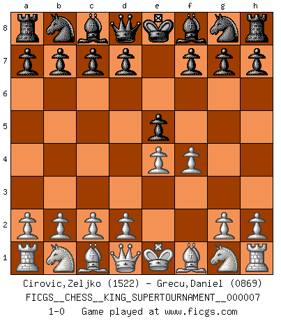 Last move : 1-0 2020 May 17 2:29:2 [Event "FICGS__CHESS__KING_SUPERTOURNAMENT__000007"] [Site "FICGS"] [Date "2020.04.16"] [Round "1"] [White "Cirovic,Zeljko"] [Black "Grecu,Daniel"] [Result "1-0"] [WhiteElo "1522"] [BlackElo "0869"] 1.e4 e5 2.f4 1-0 This chess game has been lost on time (started : 2020.04.16 16:9:28) King's gambit Player White won this chess game. Follow this game move after move (download)The most important feature of the Chess position is the activity of the pieces. This is absolutely fundamental in all phases of the game: Opening, Middlegame and especially Endgame. The primary constraint on a piece's activity is the Pawn structure. (Michael Stean) Wie kann ich Remis annehmen? Ich weiß ja gar nicht, wie ich stehe! (Fritz Sämisch) Sin errores no puede haber brillantez. (Emanuel Lasker) Le temps de noter son nom sur la feuille de partie, j'étais déjà en zeitnot ! D'un modeste amateur apparié lors de la première ronde d'un open contre le grand-maître Azmaïparashvili. There are two major products that came out of Berkeley: LSD and UNIX. We do not believe this is to be a coincidence. (Jeremy S. Anderson)