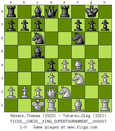 Last move : 1-0 2020 May 30 18:19:24 [Event "FICGS__CHESS__KING_SUPERTOURNAMENT__000007"] [Site "FICGS"] [Date "2020.04.16"] [Round "1"] [White "Rezack,Thomas"] [Black "Tokarev,Oleg"] [Result "1-0"] [WhiteElo "1522"] [BlackElo "1521"] 1.e4 e5 2.f4 d5 3.Nc3 d4 4.Nce2 Nc6 5.d3 exf4 6.Bxf4 Nf6 7.Qd2 Be7 8.Nf3 Bc5 9.h3 O-O 10.g4 Re8 11.O-O-O 1-0 This chess game has been lost on time (started : 2020.04.16 16:9:28) KGD : Falkbeer, Milner-Barry variation Kingside Castling by player Black (move 9) Queenside Castling by player White (move 11) Player White won this chess game. Follow this game move after move (download)Chess is a more highly symbolic game, but the aggressions are therefore even more frankly represented in the play. It probably began as a war game; that is, the representation of a miniature battle between the forces of two kingdoms. (Karl Meninger) Vielleicht wirkt die Aura früherer Spieler glanzvoller als die der heutigen Spieler, aber das liegt daran, dass man kein Programm wie Fritz hatte, das einem all die Löcher in ihren Partien zeigt. (Vladimir Kramnik) Puntos débiles o agujeros en la posición de tu oponente deben de ser ocupados por piezas, no Peones. (Siegbert Tarrasch) 'L'échange des dames est un coup dur pour les deux adversaires...' Un journaliste lors d'une partie du match Spassky-Fischer May I never be complete. May I never be content. May I never be perfect. Deliver me, Tyler, from being perfect and complete. (Chuck Palahniuk, Fight Club)