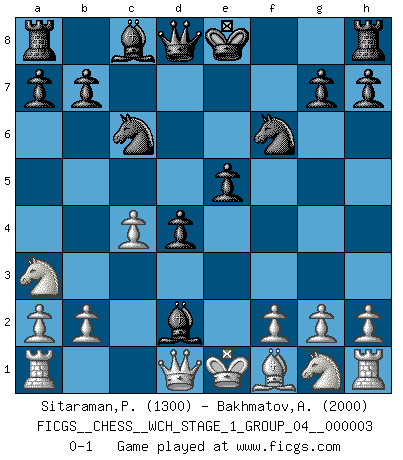 Last move : 0-1 2007 August 17 22:21:43 [Event "FICGS__CHESS__WCH_STAGE_1_GROUP_04__000003"] [Site "FICGS"] [Date "2007.07.11"] [Round "1"] [White "Sitaraman,Praveen"] [Black "Bakhmatov,Andrey"] [Result "0-1"] [WhiteElo "1300"] [BlackElo "2000"] 1.d4 Nf6 2.c4 c5 3.d5 e5 4.dxe6 fxe6 5.Nc3 d5 6.e3 d4 7.exd4 cxd4 8.Nb5 Nc6 9.Na3 e5 10.Bg5 Bb4 11.Bd2 Bxd2 0-1 Czech Benoni defense Player Black won this chess game. Follow this game move after move (download)Chess is the art which expresses the science of logic. (Mikhail Botvinnik) Im Leben werden Partien nie so unstrittig gewonnen wie im Spiel (Emanuel Lasker) Las ideas audaces son como las piezas del Ajedrez que avanzan hacia adelante. Ellas pueden ser vencidas, pero también pueden iniciar una partida victoriosa. (Goethe) L'action d'une oeuvre littéraire se déroule sur un champ de bataille. Les masques et les types du drame moderne correspondent aux pièces du jeu d'échecs. L'intrigue correspond aux coups et aux gambits, c'est à dire aux techniques du jeu telles qu'utilisées et interprétées par les joueurs. Les tactiques et les péripéties [mouvements] correspondent aux coups exécutés par l'adversaire. (Viktor Shklovsky) A good aphorism is too hard for the tooth of time, and is not worn away with the centuries, although it serves as food for every speech. (Friedrich Nietzsche)