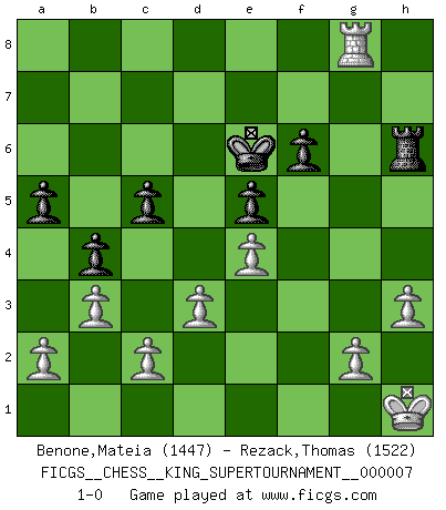Last move : 1-0 2020 August 13 0:39:17 [Event "FICGS__CHESS__KING_SUPERTOURNAMENT__000007"] [Site "FICGS"] [Date "2020.04.16"] [Round "1"] [White "Benone,Mateia"] [Black "Rezack,Thomas"] [Result "1-0"] [WhiteElo "1447"] [BlackElo "1522"] 1.e4 e5 2.f4 d6 3.Nf3 Bg4 4.h3 Bxf3 5.Qxf3 Nf6 6.Nc3 Nc6 7.Bb5 Qd7 8.fxe5 dxe5 9.Nd5 O-O-O 10.Nxf6 gxf6 11.Qxf6 Be7 12.Bxc6 Bxf6 13.Bxd7+ Rxd7 14.d3 Rg8 15.O-O Bh8 16.Be3 f6 17.Kh2 Rdg7 18.Rf2 Rg3 19.Bc5 h5 20.Raf1 h4 21.Rg1 b6 22.Bb4 c5 23.Be1 Kd7 24.Rf5 Ke6 25.Bxg3 hxg3+ 26.Kh1 Rg6 27.Rh5 Bg7 28.Rf1 Bh6 29.b3 b5 30.Rf3 a5 31.Rxh6 Rxh6 32.Rxg3 b4 33.Rg8 1-0 This chess game has been lost on time (started : 2020.04.16 16:9:28) King's gambit Queenside Castling by player Black (move 9) Kingside Castling by player White (move 15) Player White won this chess game. Follow this game move after move (download)In Chess, at least, the brave inherit the earth. (Edmar Mednis) Woher wissen wir, daß der Neanderthaler Blindschach gespielt hat? -- Bei Ausgrabungen wurden keine Schachbretter und Figuren gefunden. (Anonymous) La señal de un Gran Maestro es su habilidad de ganar una partida rápidamente y sin dolor. (Irving Chernev) Ce n'est pas pour s'amuser qu'il joue aux échecs : il célèbre un culte. (Vladimir Nabokov) If you ain't just a little scared when you enter a casino, you are either very rich or you haven't studied the games enough. (Pappy)