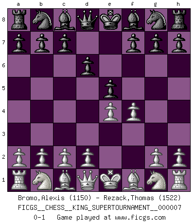 Last move : 0-1 2020 May 17 2:29:2 [Event "FICGS__CHESS__KING_SUPERTOURNAMENT__000007"] [Site "FICGS"] [Date "2020.04.16"] [Round "1"] [White "Bromo,Alexis"] [Black "Rezack,Thomas"] [Result "0-1"] [WhiteElo "1150"] [BlackElo "1522"] 1.e4 e5 2.f4 d6 0-1 This chess game has been lost on time (started : 2020.04.16 16:9:28) King's gambit Player Black won this chess game. Follow this game move after move (download)The hallmark of the artist is simplicity. (Larry Evans) Es war undenkbar für die Behörden, dass ein sowjetischer Großmeister auf diese Art und Weise [Fischer-Taimanov 6:0] verliert, ohne dass es eine politischer Erklärung dafür gäbe. (Mark Taimanov) Me gusta decir que Bobby Fischer fue el mejor jugador que jamás haya existido. Pero lo que hizo de Fischer un genio, fue su habilidad de mezclar una frescura y pragmatismo Americano con ideas Rusas acerca de la estrategia. (Bruce Pandolfini) Avec des compensations pour le matériel en plus... (Anonyme) Life doesn't imitate art, it imitates bad television. (Woody Allen)