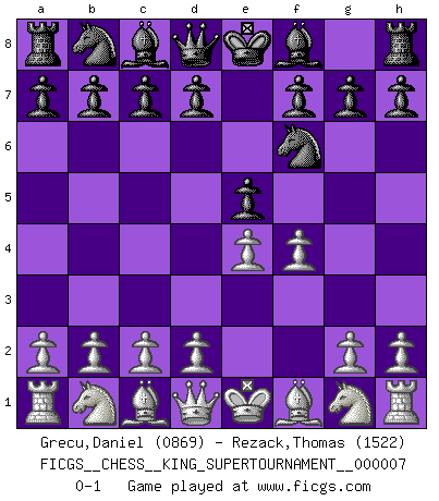 Last move : 0-1 2020 May 17 2:29:2 [Event "FICGS__CHESS__KING_SUPERTOURNAMENT__000007"] [Site "FICGS"] [Date "2020.04.16"] [Round "1"] [White "Grecu,Daniel"] [Black "Rezack,Thomas"] [Result "0-1"] [WhiteElo "0869"] [BlackElo "1522"] 1.e4 e5 2.f4 Nf6 0-1 This chess game has been lost on time (started : 2020.04.16 16:9:28) KGD : 2...Nf6 Player Black won this chess game. Follow this game move after move (download)The older I grow, the more I value Pawns. (Keres) Die jungen Leute sollen verstehen, dass sie noch etwas von mir lernen können und müssen. (Viktor Kortschnoi) Morphy probablemente fue el genio más grande de todos. (Bobby Fischer) Vous n'êtes pas toujours obligé de jouer le meilleur coup. Un coup doit être actif, entreprenant, correct et beau ! (David Bronstein) Now the reason the enlightened prince and the wise general conquer the enemy whenever they move and their achievements surpass those of ordinary men is foreknowledge. (Sun Tzu)