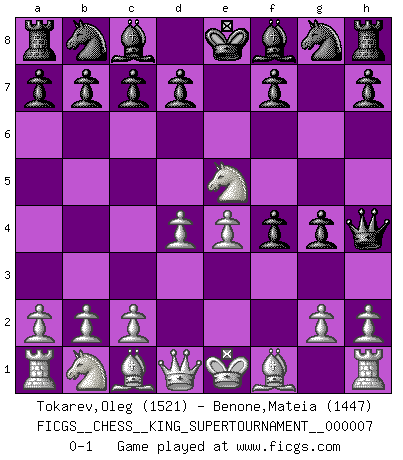 Last move : 0-1 2020 June 16 23:31:1 [Event "FICGS__CHESS__KING_SUPERTOURNAMENT__000007"] [Site "FICGS"] [Date "2020.04.16"] [Round "1"] [White "Tokarev,Oleg"] [Black "Benone,Mateia"] [Result "0-1"] [WhiteElo "1521"] [BlackElo "1447"] 1.e4 e5 2.f4 exf4 3.Nf3 g5 4.d4 g4 5.Ne5 Qh4+ 0-1 This chess game has been lost on time (started : 2020.04.16 16:9:28) KGA : Soerensen gambit Player Black won this chess game. Follow this game move after move (download)Help your pieces so they can help you. (Paul Morphy) Fischer ist das größte Genie, das je vom Schachhimmel heruntergestiegen ist. (Mikhail Nekhemyevich Tal) De eso se trata el Ajedrez. Un día le das una lección a tu oponente y al día siguiente el te da una a tí. (Bobby Fischer) Demandez au pauvre Cg1 ce qu'il en pense. Eduard Gufeld à propos de la variante Saemisch de l'Est-Indienne. Winning isn't everything... but losing is nothing. (Mednis)