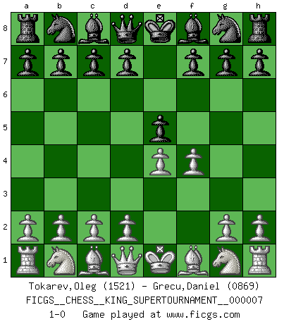 Last move : 1-0 2020 May 17 2:29:2 [Event "FICGS__CHESS__KING_SUPERTOURNAMENT__000007"] [Site "FICGS"] [Date "2020.04.16"] [Round "1"] [White "Tokarev,Oleg"] [Black "Grecu,Daniel"] [Result "1-0"] [WhiteElo "1521"] [BlackElo "0869"] 1.e4 e5 2.f4 1-0 This chess game has been lost on time (started : 2020.04.16 16:9:28) King's gambit Player White won this chess game. Follow this game move after move (download)The game of Chess is not merely an idle amusement; several very valuable qualities of the mind are to be acquired and strengthened by it, so as to become habits ready on all occasions; for life is a kind of Chess. (Benjamin Franklin) Jeder Schachmeister war einmal ein Anfänger. (Irving Chernev) Todos los Maestros de Ajedrez fueron un día unos principiantes. (Chernev) L'ordinateur a tué l'originalité. Il n'y a plus guère d'aventures sur l'échiquier. (Jacob Murray) Excelling at chess has long been considered a symbol of more general intelligence. That is an incorrect assumption in my view, as pleasant as it might be. But for the purposes of argument and investigation, chess is, in Russkin-Gutman's words, 'an unparalleled laboratory, since both the learning process and the degree of ability obtained can be objectified and quantified, providing an excellent comparative framework on which to use rigorous analytical techniques.' (The Chess Master and the Computer, by Garry Kasparov - 2010)