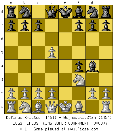 Last move : 0-1 2020 May 22 12:5:5 [Event "FICGS__CHESS__KING_SUPERTOURNAMENT__000007"] [Site "FICGS"] [Date "2020.04.16"] [Round "1"] [White "Kofinas,Xristos"] [Black "Wojnowski,Stan"] [Result "0-1"] [WhiteElo "1461"] [BlackElo "1454"] 1.e4 e5 2.f4 d5 3.exd5 exf4 4.Nf3 Bg4 0-1 This chess game has been lost on time (started : 2020.04.16 16:9:28) KGD : Falkbeer counter-gambit Player Black won this chess game. Follow this game move after move (download)It is not enough to be a good player... you must also play well. (Siegbert Tarrasch) Es ist schade, dass viele Schachsportler vergessen, wie wichtig Auftreten und angemessene Kleidung sind. (Alexandra Kosteniuk) La captura del Rey enemigo es la finalidad pero no el primer objetivo de la partida. (William Steinitz) Le temps de noter son nom sur la feuille de partie, j'étais déjà en zeitnot ! D'un modeste amateur apparié lors de la première ronde d'un open contre le grand-maître Azmaïparashvili. The mind is like a parachute, it only functions when its open. (Unknown)
