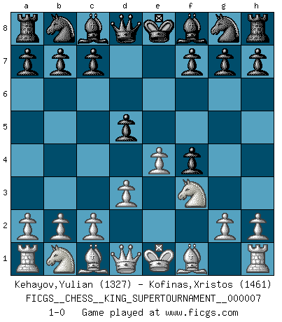 Last move : 1-0 2020 May 20 6:27:22 [Event "FICGS__CHESS__KING_SUPERTOURNAMENT__000007"] [Site "FICGS"] [Date "2020.04.16"] [Round "1"] [White "Kehayov,Yulian"] [Black "Kofinas,Xristos"] [Result "1-0"] [WhiteElo "1327"] [BlackElo "1461"] 1.e4 e5 2.f4 exf4 3.Nf3 d5 4.d3 1-0 This chess game has been lost on time (started : 2020.04.16 16:9:28) KGA : Abbazia defense (Classical defense, Modern defense!) Player White won this chess game. Follow this game move after move (download)By the beauty of his games, the clarity of his play, and the brilliance of his ideas, Fischer made himself an artist of the same stature as Brahms, Rembrandt, and Shakespeare. (David Levy) Wir können eben der zündenden Macht des Opfers nicht wiederstehen, denn die Begeisterung für das Opfer liegt in der Natur des Menschen. (Rudolf Spielmann) Cualquier cambio de material en una posición debe venir por medio de un mate, una captura o promoción de Peón. (Purdy) Il vaut mieux sacrifier les pièces de l'adversaire. (Xavier Tartacover) 'preceded by its own quotation yields a falsehood' preceded by its own quotation yields a falsehood. (W. V. O. Quine - Set Theory And Its Logic, 1953)