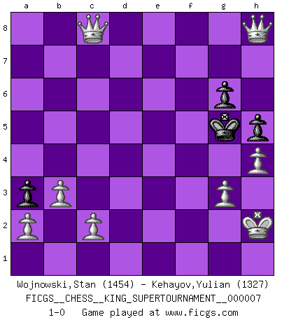 Last move : 1-0 2020 June 26 15:0:9 [Event "FICGS__CHESS__KING_SUPERTOURNAMENT__000007"] [Site "FICGS"] [Date "2020.04.16"] [Round "1"] [White "Wojnowski,Stan"] [Black "Kehayov,Yulian"] [Result "1-0"] [WhiteElo "1454"] [BlackElo "1327"] 1.e4 e5 2.f4 Nf6 3.Nc3 exf4 4.Nf3 d6 5.d4 Be7 6.Bxf4 O-O 7.Bc4 c6 8.O-O b5 9.Bd3 Nh5 10.e5 Nxf4 11.Be4 d5 12.Bd3 h6 13.Ne2 Nxd3 14.Qxd3 Be6 15.Nf4 Na6 16.Nxe6 fxe6 17.h3 c5 18.Kh2 c4 19.Qg6 Qe8 20.Qxe6+ Qf7 21.Qxa6 Qe8 22.e6 Rf6 23.Ne5 Bd8 24.Rxf6 Bxf6 25.Re1 Bxe5+ 26.Rxe5 Qe7 27.Rxd5 Rd8 28.Qxb5 Rxd5 29.Qxd5 Kh7 30.Qxc4 Kh8 31.d5 Qd6+ 32.g3 Kh7 33.Qc6 Qxc6 34.dxc6 a5 35.c7 a4 36.c8Q a3 37.b3 h5 38.e7 Kh6 39.e8Q g6 40.Qh8+ Kg5 41.h4+ 1-0 KGD : 2...Nf6 Kingside Castling by player Black (move 6) Kingside Castling by player White (move 8) Promotion Queen by player White (move 36) Promotion Queen by player White (move 39) Player White won this chess game. Follow this game move after move (download)Chess holds its master in its own bonds, shackling the mind and brain so that the inner freedom of the very strongest must suffer. (Albert Einstein) Kleine Schachspieler machen Mist, und große Schachspieler machen Mist, aber große machen weniger Mist. (Fritz Sämisch) El Ajedrez es 99 por ciento táctica. (Teichmann) Le jeu d'échecs est comme rejeté hors du temps. (Antoine de Saint-Exupéry) Opportunities multiply as they are seized. (Sun Tzu)