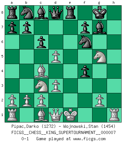 Last move : 0-1 2020 May 29 4:14:25 [Event "FICGS__CHESS__KING_SUPERTOURNAMENT__000007"] [Site "FICGS"] [Date "2020.04.16"] [Round "1"] [White "Pipac,Darko"] [Black "Wojnowski,Stan"] [Result "0-1"] [WhiteElo "1272"] [BlackElo "1454"] 1.e4 e5 2.f4 exf4 3.Nf3 g5 4.Nc3 h6 5.h3 Bg7 6.Bc4 Nf6 7.d3 O-O 8.h4 c6 9.hxg5 hxg5 10.Nxg5 d5 11.exd5 Re8+ 0-1 This chess game has been lost on time (started : 2020.04.16 16:9:28) KGA : Quaade gambit Kingside Castling by player Black (move 7) Player Black won this chess game. Follow this game move after move (download)A strong memory, concentration, imagination, and a strong will is required to become a great Chess player. (Bobby Fischer) Sie bekommen vielleicht den Eindruck, dass die Spitzenspieler überhaupt gar nicht so stark sind. Aber das stimmt nicht. Es ist eine Illusion. Mit einem Computer an der Seite ist es sehr leicht, Urteile zu fällen, aber wenn man alleine am Brett sitzt, sieht die Sache ganz anders aus. (Vladimir Kramnik) Solo existe una cosa que Fischer hace en el Ajedrez sin placer: ¡perder!. (Boris Spassky) On peut tirer plus d'utilité d'une partie perdue que de 100 parties gagnées. (Capablanca) I don't diet. I just don't eat as much as I'd like to. (Linda Evangelista, supermodel)