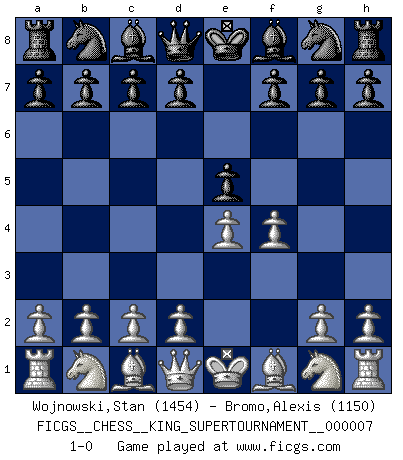 Last move : 1-0 2020 May 17 2:29:2 [Event "FICGS__CHESS__KING_SUPERTOURNAMENT__000007"] [Site "FICGS"] [Date "2020.04.16"] [Round "1"] [White "Wojnowski,Stan"] [Black "Bromo,Alexis"] [Result "1-0"] [WhiteElo "1454"] [BlackElo "1150"] 1.e4 e5 2.f4 1-0 This chess game has been lost on time (started : 2020.04.16 16:9:28) King's gambit Player White won this chess game. Follow this game move after move (download)Whoever sees no other aim in the game than that of giving checkmate to one's opponent will never become a good Chess player. (Euwe) Ein Springer auf f6 gegen die eigene Rochadestellung ist schlimmer als ein rostiger Nagel im Knie. (Efim Bogoljubov) Fischer sacrificó virtualmente todo lo que la mayoría de nosotros los 'debiles' (término que él usa) valoramos, respetamos y apreciamos por el amor de un astuto, a menudo hermoso tablero de juego, por el privilegio ambivalente de ser su mas grande maestro. (Paul Kollar) Que feriez-vous si vous étiez en train de jouer aux échecs et que la fin du monde arrive ? Je continuerais à jouer. (Saint Borromée) The obstacle is the path. (Zen proverb)