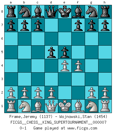 Last move : 0-1 2020 May 17 2:29:2 [Event "FICGS__CHESS__KING_SUPERTOURNAMENT__000007"] [Site "FICGS"] [Date "2020.04.16"] [Round "1"] [White "Frame,Jeremy"] [Black "Wojnowski,Stan"] [Result "0-1"] [WhiteElo "1137"] [BlackElo "1454"] 1.e4 e5 2.f4 d5 0-1 This chess game has been lost on time (started : 2020.04.16 16:9:28) KGD : Falkbeer counter-gambit Player Black won this chess game. Follow this game move after move (download)Chess is a terrible game. If you have no center, your opponent has a freer position. If you do have a center, then you really have something to worry about ! (Siegbert Tarrasch) Ein guter Spieler hat immer Glück. (José Raúl Capablanca) El Ajedrez es una hermosa aventura. (Bent Larsen) Les écrivains ont utilisé les échecs pour analyser les côtés extrêmes de la nature humaine. Dans ce cadre, les échecs offrent un champ d'expérimentation idéal. Mais on pourrait faire la même chose avec la peinture. Et là, en vous référant à Van Gogh, vous ne tirerez pas de conclusion définitive sur les peintres. (Gary Kasparov) Memory is a crazy woman that hoards colored rags and throws away food. (Austin O'Malley)