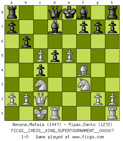 Last move : 1-0 2020 June 25 12:21:47 [Event "FICGS__CHESS__KING_SUPERTOURNAMENT__000007"] [Site "FICGS"] [Date "2020.04.16"] [Round "1"] [White "Benone,Mateia"] [Black "Pipac,Darko"] [Result "1-0"] [WhiteElo "1447"] [BlackElo "1272"] 1.e4 e5 2.f4 exf4 3.Nf3 Nf6 4.e5 Nd5 5.c4 Nb6 6.d4 d5 7.c5 Nc4 8.Bxc4 dxc4 9.Bxf4 Bg4 10.Nc3 Nc6 11.d5 Nb4 12.Qa4+ c6 13.Qxb4 cxd5 14.O-O-O b6 15.Qa4+ Bd7 16.Qc2 1-0 This chess game has been lost on time (started : 2020.04.16 16:9:28) KGA : Schallop defense Queenside Castling by player White (move 14) Player White won this chess game. Follow this game move after move (download)A thorough understanding of the typical mating continuations makes the most complicated sacrificial combinations leading up to them not only not difficult, but almost a matter of course. (Siegbert Tarrasch) Ich hatte Zahnschmerzen im ersten Spiel. In der zweiten Partie tat mir der Kopf weh. In der dritten war es eine Rheuma-Attacke und während der vierten fühlte ich mich nicht gut. Und in der fünften? Nun, man muss doch nicht jedes Spiel gewinnen, oder? (Savielly Grigorievitsch Tartakower) El Ajedrez es un expediente tonto que hace creer a la gente inactiva que hacen una cosa muy astuta cuando solamente estan perdiendo su tiempo. (George Bernard Shaw) Le profane ne songe pas à la somme de jouissance dont il se prive, qui méconnaît ce jeu aux ressources aussi variées que passionnantes. (Jean-Marie Jeanton-Lamarche) A generalist learns less and less about more and more until he knows nothing about everything. (Author unknown)