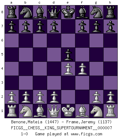 Last move : 1-0 2020 May 17 2:29:2 [Event "FICGS__CHESS__KING_SUPERTOURNAMENT__000007"] [Site "FICGS"] [Date "2020.04.16"] [Round "1"] [White "Benone,Mateia"] [Black "Frame,Jeremy"] [Result "1-0"] [WhiteElo "1447"] [BlackElo "1137"] 1.e4 e5 2.f4 1-0 This chess game has been lost on time (started : 2020.04.16 16:9:28) King's gambit Player White won this chess game. Follow this game move after move (download)The Pawns are the soul of the game. (Francois Andre Danican Philidor) Lisa Lane, amerikanische Schachmeisterin, hatte Fischer einmal als stärksten lebenden Spieler bezeichnet. Antwort: Das ist richtig, aber Lisa Lane ist eigentlich nicht in der Lage, das zu beurteilen. (Robert James Fischer) Muchos jugadores de Ajedrez se sorprendían cuando después de la partida, Fischer explicaba con calma: 'Yo ya había analizado esta posibilidad' en una posición en la cual yo creía que no era posible de prever desde la apertura. (Mikhail Tal) Psychologiquement, tu dois avoir confiance en toi même, mais cette confiance doit être basée sur des faits. (Robert Fischer) Only sick music makes money today. (Friedrich Nietzsche)