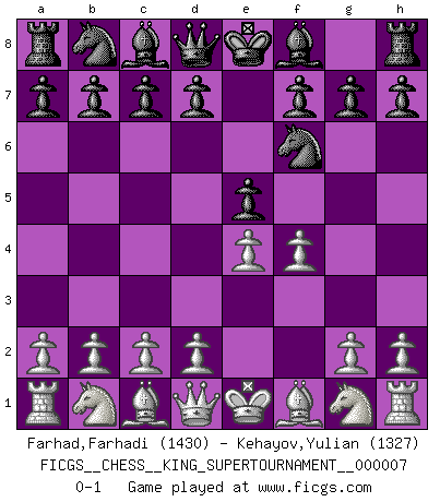 Last move : 0-1 2020 May 17 2:29:2 [Event "FICGS__CHESS__KING_SUPERTOURNAMENT__000007"] [Site "FICGS"] [Date "2020.04.16"] [Round "1"] [White "Farhad,Farhadi"] [Black "Kehayov,Yulian"] [Result "0-1"] [WhiteElo "1430"] [BlackElo "1327"] 1.e4 e5 2.f4 Nf6 0-1 This chess game has been lost on time (started : 2020.04.16 16:9:28) KGD : 2...Nf6 Player Black won this chess game. Follow this game move after move (download)A bad plan is better than none at all. (Frank Marshall) Wie bekannt hörte Morphy 1859 auf, Schach zu spielen. Seine Enttäuschung galt nicht so sehr dem Schach, wie den Schachspielern. (Robert James Fischer) ¿Porque tengo que perder ante este idiota?. (Aron Nimzovich) Je fais ceci parce que dans cinquante coups j'obtiendrai cela; je m'appelle Mikhail Moisevitch Botvinnik. (Botvinnik) Whoever said the pen is mightier than the sword obviously never encountered automatic weapons. (US General Douglas MacArthur)