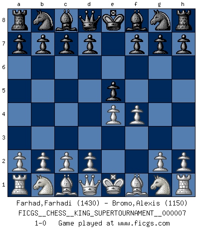 Last move : 1-0 2020 May 17 2:29:2 [Event "FICGS__CHESS__KING_SUPERTOURNAMENT__000007"] [Site "FICGS"] [Date "2020.04.16"] [Round "1"] [White "Farhad,Farhadi"] [Black "Bromo,Alexis"] [Result "1-0"] [WhiteElo "1430"] [BlackElo "1150"] 1.e4 e5 2.f4 1-0 This chess game has been lost on time (started : 2020.04.16 16:9:28) King's gambit Player White won this chess game. Follow this game move after move (download)We cannot resist the fascination of sacrifice, since a passion for sacrifices is part of a Chessplayer's nature. (Rudolf Spielman) Es ist wirklich schade, dass so viele Schachspieler nicht auf ihr Äußeres achten! (Alexandra Kosteniuk) Para mi, el Ajedrez es la vida y cada partida es como una nueva vida. Todo jugador de Ajedrez suele vivir muchas vidas durante su vida. (Eduard Gufeld) Je crois qu'il existe des manières très spécifiques de jouer efficacement contre une machine. Evidemment, nous n'avons aucune chance en technique pure, parce que l'ordinateur calcule de manière parfaite. Mais lorsque nous faisons appel à notre cerveau, en utilisant l'intuition et la compréhension, alors nous restons beaucoup plus forts. (Anatoli Karpov) Pushing plastic is for the many, pushing virtual pieces is for the fewer, pushing wood is for the very few. (Normajean Yates)