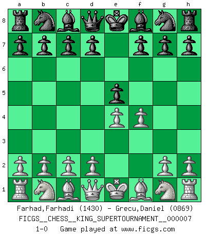 Last move : 1-0 2020 May 17 2:29:2 [Event "FICGS__CHESS__KING_SUPERTOURNAMENT__000007"] [Site "FICGS"] [Date "2020.04.16"] [Round "1"] [White "Farhad,Farhadi"] [Black "Grecu,Daniel"] [Result "1-0"] [WhiteElo "1430"] [BlackElo "0869"] 1.e4 e5 2.f4 1-0 This chess game has been lost on time (started : 2020.04.16 16:9:28) King's gambit Player White won this chess game. Follow this game move after move (download)Do you realize Fischer almost never has any bad pieces? He exchanges them, and the bad pieces remain with his opponents. (Yuri Balashov) Er war ein guter Schachspieler, aber ich kann Leute nicht ausstehen, die 'Heil Hitler' rufen (Über Alexander Aljechin). (Miguel Najdorf) Una clavada es mas poderosa que una espada. (Fred Reinfeld) Le succès, c'est être capable d'aller d'échec en échec sans perdre son enthousiasme. (Winston Churchill) Tomorrow's what you make of it. (Horatio Caine, C.S.I. Miami)