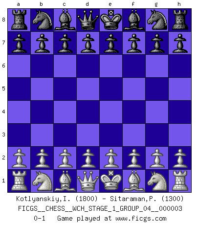 Last move : 0-1 2007 August 10 21:3:22 [Event "FICGS__CHESS__WCH_STAGE_1_GROUP_04__000003"] [Site "FICGS"] [Date "2007.07.11"] [Round "1"] [White "Kotlyanskiy,Ilya"] [Black "Sitaraman,Praveen"] [Result "0-1"] [WhiteElo "1800"] [BlackElo "1300"] 0-1 This chess game has been lost on time (started : 2007.07.11 16:53:34) Player Black won this chess game. Follow this game move after move (download)Capture of the adverse King is the ultimate but not the first object of the game. (William Steinitz) Jede Eröffnung ist gut genug um gespielt zu werden, wenn nur ihr Ruf schlecht genug ist. (Savielly Grigorievitsch Tartakower) Peones: ellos son el alma de esta partida, solos forman el ataque y la defensa. (Philidor) Nous vivons dans un monde échiquéen : chaque jour qui passe est un défi à relever. (Philosophe Sasha) A married woman is like a fish riding a bicycle. (Rodolfo d'Ettorre)