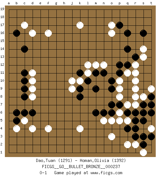 Last move : 0-1 2020 April 19 7:49:41 [Event "FICGS__GO__BULLET_BRONZE__000237 "] [Site "FICGS"] [Date "2020.04.19"] [Round "1"] [Black "Dao,Tuan "] [White "Homan,Olivia "] [Result "0-1"] [Rating 1 "1291"] [Rating 2 "1392"] 1.q4 d16 2.q16 d4 3.q10 o17 4.p17 o16 5.q14 k17 6.c14 f16 7.b16 c17 8.c11 o3 9.r6 k4 10.c6 c5 11.d6 f4 12.b5 b4 13.b6 q2 14.r3 o5 15.p7 r12 16.q12 q11 17.p11 r11 18.p12 r10 19.q9 s14 20.r13 s13 21.s16 s8 22.s7 r8 23.q8 r7 24.s6 q7 25.q6 p6 26.o6 p5 27.n6 n5 28.m6 r2 29.s2 s1 30.s3 q5 31.r5 s4 32.r4 t5 33.s5 t4 34.t3 r9 35.t6 t4 36.t8 t9 37.t7 p8 38.o7 p10 39.o10 p9 40.o9 n12 41.n11 m12 42.m11 l11 43.l10 k10 44.k11 l12 45.k9 j10 46.m9 j9 47.k8 d10 48.c10 d9 49.c9 d8 50.c8 d11 0-1 Here are the names of the openings (joseki) played in the four corners : Corner q16 : q16 o17Hoshi (Hwajeom, Seongjeom, Xingwei`) 4-4 Point. The star or hoshi (4-4) point, emphasizing influence at the potential expense of territory.Ikken Kakari (Hankan Keolch'im, Yi Gua`jiao~, 1-Space Low Approach). White 2 is the standard approach move to the 4-4. Corner d16 : d16 c14Hoshi (Hwajeom, Seongjeom, Xingwei`) 4-4 Point. The star or hoshi (4-4) point, emphasizing influence at the potential expense of territory.Ikken Kakari (Hankan Keolch'im, Yi Gua`jiao~, 1-Space Low Approach). Black 2 is the standard approach move to the 4-4. Corner q4 : q4 o3Hoshi (Hwajeom, Seongjeom, Xingwei`) 4-4 Point. The star or hoshi (4-4) point, emphasizing influence at the potential expense of territory.Ikken Kakari (Hankan Keolch'im, Yi Gua`jiao~, 1-Space Low Approach). White 2 is the standard approach move to the 4-4. Corner d4 : d4 c6Hoshi (Hwajeom, Seongjeom, Xingwei`) 4-4 Point. The star or hoshi (4-4) point, emphasizing influence at the potential expense of territory.Ikken Kakari (Hankan Keolch'im, Yi Gua`jiao~, 1-Space Low Approach). Black 2 is the standard approach move to the 4-4. Player White won this Go (weiqi, baduk) game.Follow this game move after move (download ) The strong player plays straight, the weak diagonally. (Anonymous) God, you are such an idiot. - Actually, I thought I was more of a jerk. (Gregory House to Stacy Warner, House M.D.)