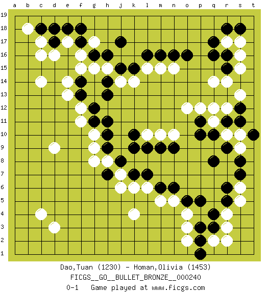 Last move : 0-1 2020 April 19 9:14:29 [Event "FICGS__GO__BULLET_BRONZE__000240"] [Site "FICGS"] [Date "2020.04.19"] [Round "1"] [Black "Dao,Tuan"] [White "Homan,Olivia"] [Result "0-1"] [Rating 1 "1230"] [Rating 2 "1453"] 1.q4 d16 2.q16 d3 3.q10 o3 4.r6 k4 5.f17 c14 6.d18 c17 7.j17 d9 8.c18 r14 9.r15 q14 10.o16 s10 11.r9 s9 12.s8 r10 13.q8 q11 14.p10 r3 15.q3 q2 16.p2 r2 17.p3 s5 18.r5 s6 19.s7 r4 20.p5 o2 21.p1 o4 22.o5 n5 23.n6 m5 24.m6 l6 25.l7 k6 26.k7 j7 27.j8 h8 28.h7 j6 29.h9 g8 30.k9 g9 31.h10 g10 32.h11 o12 33.p11 p12 34.r11 q12 35.s11 r12 36.s12 s13 37.t10 r17 38.q17 s15 39.r16 s16 40.r18 s17 41.s18 n15 42.n16 m15 43.m16 l15 44.l16 n10 45.n9 m10 46.m9 l10 47.l9 c4 48.k10 f12 49.g11 f11 50.h13 f16 51.g16 e17 52.e18 g15 53.h16 g17 54.f18 h15 55.j15 j14 56.k15 k14 57.h14 f15 58.f13 e13 59.f14 e14 60.g12 b18 61.d17 c16 0-1 Here are the names of the openings (joseki) played in the four corners : Corner q4 : q4 o3 Hoshi (Hwajeom, Seongjeom, Xingwei`) 4-4 Point. The star or hoshi (4-4) point, emphasizing influence at the potential expense of territory. Ikken Kakari (Hankan Keolch'im, Yi Gua`jiao~, 1-Space Low Approach). White 2 is the standard approach move to the 4-4. Corner d16 : d16 f17 Hoshi (Hwajeom, Seongjeom, Xingwei`) 4-4 Point. The star or hoshi (4-4) point, emphasizing influence at the potential expense of territory. Ikken Kakari (Hankan Keolch'im, Yi Gua`jiao~, 1-Space Low Approach). Black 2 is the standard approach move to the 4-4. Corner q16 : q16 r14 Hoshi (Hwajeom, Seongjeom, Xingwei`) 4-4 Point. The star or hoshi (4-4) point, emphasizing influence at the potential expense of territory. Ikken Kakari (Hankan Keolch'im, Yi Gua`jiao~, 1-Space Low Approach). White 2 is the standard approach move to the 4-4. Player White won this Go (weiqi, baduk) game. Follow this game move after move (download)A knight's move near the edge of the board cannot be cut. (Bill Taylor) A bird doesn't sing because it has an answer, it sings because it has a song. (Maya Angelou)