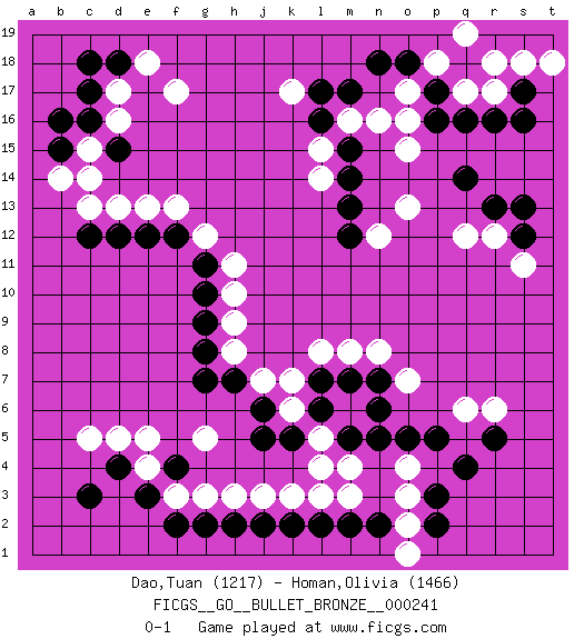 Last move : 0-1 2020 April 19 19:25:14 [Event "FICGS__GO__BULLET_BRONZE__000241"] [Site "FICGS"] [Date "2020.04.19"] [Round "1"] [Black "Dao,Tuan"] [White "Homan,Olivia"] [Result "0-1"] [Rating 1 "1217"] [Rating 2 "1466"] 1.q4 d16 2.q16 e4 3.c3 c5 4.e3 f3 5.d4 d5 6.f4 e5 7.f2 g3 8.g2 h3 9.h2 j3 10.j2 k3 11.k2 l3 12.l2 m3 13.m2 o3 14.n2 r6 15.r5 q6 16.p3 o2 17.p2 o4 18.p5 o7 19.o5 o1 20.n5 m4 21.m5 l5 22.l6 k6 23.k5 l4 24.j6 k7 25.j5 m6 26.l7 l8 27.m7 m8 28.n7 n8 29.n6 j7 30.h7 h8 31.g7 g5 32.g8 h9 33.g9 h10 34.g10 h11 35.g11 g12 36.f12 f13 37.e12 e13 38.d12 d13 39.c12 c13 40.c17 d17 41.c16 c15 42.b15 b14 43.d15 c14 44.d18 e18 45.c18 f17 46.b16 o17 47.m17 k17 48.m15 o15 49.q14 o13 50.m13 n12 51.m12 r12 52.r13 q12 53.s12 s11 54.s13 r17 55.r16 q17 56.s17 s18 57.s16 t18 58.p16 o16 59.p17 p18 60.q18 r18 61.o18 q19 62.n18 l14 63.m14 m16 64.l16 n16 65.l17 l15 0-1 Here are the names of the openings (joseki) played in the four corners : Corner d4 : e4 c3 Takamoku (Gomok, Gaomu`) 5-4 Point. The takamoku (high) point (5-4). With its emphasis on influence, the 5-4 point complements the 4-4 (hoshi) point in creating an influence-oriented fuseki. San-san. Black plays the 3-3 when White has a stone at top such as marked. Corner q4 : q4 l3 Hoshi (Hwajeom, Seongjeom, Xingwei`) 4-4 Point. The star or hoshi (4-4) point, emphasizing influence at the potential expense of territory. Corner q16 : q16 o17 Hoshi (Hwajeom, Seongjeom, Xingwei`) 4-4 Point. The star or hoshi (4-4) point, emphasizing influence at the potential expense of territory. Ikken Kakari (Hankan Keolch'im, Yi Gua`jiao~, 1-Space Low Approach). White 2 is the standard approach move to the 4-4. Player White won this Go (weiqi, baduk) game. Follow this game move after move (download)In the sound of the stone you can hear its purpose. (Pierre Audouard) There are three kinds of lies: lies, damned lies and statistics. (Mark Twain)
