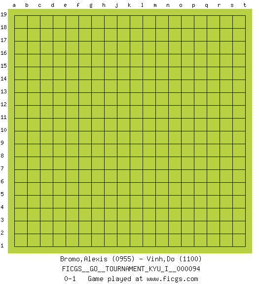 Last move : 0-1 2020 May 20 6:27:22 [Event "FICGS__GO__TOURNAMENT_KYU_I__000094"] [Site "FICGS"] [Date "2020.04.19"] [Round "1"] [Black "Bromo,Alexis"] [White "Vinh,Do"] [Result "0-1"] [Rating 1 "0955"] [Rating 2 "1100"] 0-1 This go game has been lost on time (started : 2020.04.19 19:53:24) Here are the names of the openings (joseki) played in the four corners : Player White won this Go (weiqi, baduk) game. Follow this game move after move (download)The carpenter's square becomes ko. (Anonymous) For to win one hundred victories in one hundred battles is not the acme of skill. To subdue the enemy without fighting is the acme of skill. (Sun Tzu)