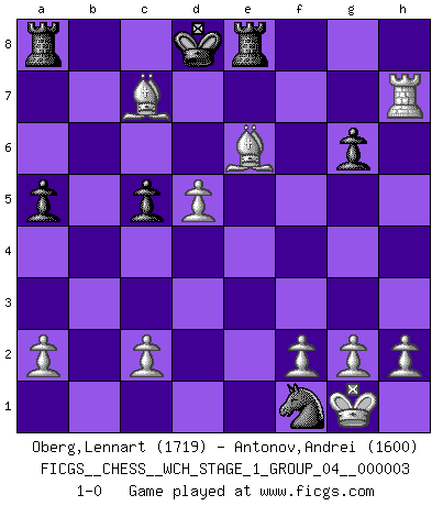 Last move : 1-0 2007 September 10 18:29:8 [Event "FICGS__CHESS__WCH_STAGE_1_GROUP_04__000003"] [Site "FICGS"] [Date "2007.07.11"] [Round "1"] [White "Oberg,Lennart"] [Black "Antonov,Andrei"] [Result "1-0"] [WhiteElo "1719"] [BlackElo "1600"] 1.Nf3 g6 2.e4 Bg7 3.d4 b6 4.Nc3 Bb7 5.Bc4 a5 6.O-O e6 7.d5 Bxc3 8.bxc3 c6 9.Qd4 f6 10.dxe6 dxe6 11.Bxe6 Qxd4 12.cxd4 c5 13.d5 Nd7 14.Rb1 Ne5 15.Nxe5 fxe5 16.Bb2 Nf6 17.Bxe5 Rf8 18.Rxb6 Nxe4 19.Rxb7 Nd2 20.Bd6 Nxf1 21.Re7+ Kd8 22.Rxh7 Re8 23.Bc7+ 1-0 Reti Opening Kingside Castling by player White (move 6) Player White won this chess game. Follow this game move after move (download)A big shock; the best chess player in history has passed away. (Lajos Portisch, about Bobby Fischer's death) Ich moechte nie einem Club beitreten, der Leute wie mich als Mitglieder aufnimmt. (Woody Allen) El Ajedrez es 99 por ciento táctica. (Teichmann) Pour se monter efficace, un Cavalier a besoin d'avant-postes ! Les Cavaliers font les meilleurs bloqueurs de pions passés. Man with more than one clock never knows what time it is. (Chinese thought)
