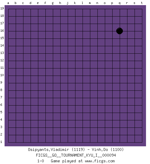 Last move : 1-0 2020 May 20 6:27:22 [Event "FICGS__GO__TOURNAMENT_KYU_I__000094"] [Site "FICGS"] [Date "2020.04.19"] [Round "1"] [Black "Osipyants,Vladimir"] [White "Vinh,Do"] [Result "1-0"] [Rating 1 "1119"] [Rating 2 "1100"] 1.q16 1-0 This go game has been lost on time (started : 2020.04.19 19:53:24) Here are the names of the openings (joseki) played in the four corners : Player Black won this Go (weiqi, baduk) game. Follow this game move after move (download)I really believe that Go is destined to take the place of Chess as the leading intellectual game of the Occident, just as it has reigned supreme in the Orient for some four thousand years. (Edward Lasker, international chess master) It is not titles that honor men, but men that honor titles. (Niccolo Machiavelli)