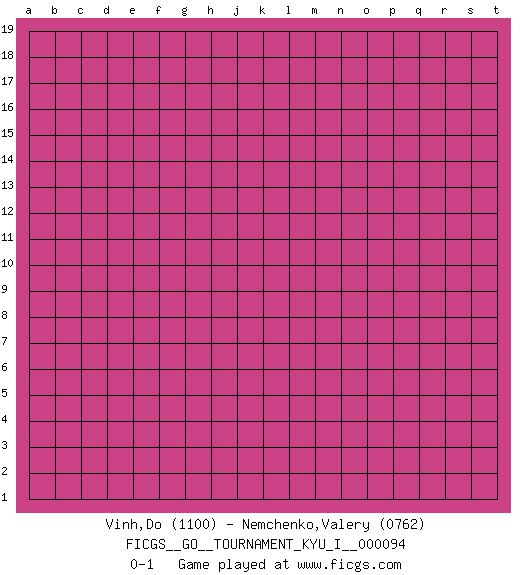 Last move : 0-1 2020 May 20 6:27:22 [Event "FICGS__GO__TOURNAMENT_KYU_I__000094"] [Site "FICGS"] [Date "2020.04.19"] [Round "1"] [Black "Vinh,Do"] [White "Nemchenko,Valery"] [Result "0-1"] [Rating 1 "1100"] [Rating 2 "0762"] 0-1 This go game has been lost on time (started : 2020.04.19 19:53:24) Here are the names of the openings (joseki) played in the four corners : Player White won this Go (weiqi, baduk) game. Follow this game move after move (download)Do not make moves that strengthen your opponent ! (Anonymous) There's always a bigger fish. (Qui-Gon Jinn in Star Wars ep.1)