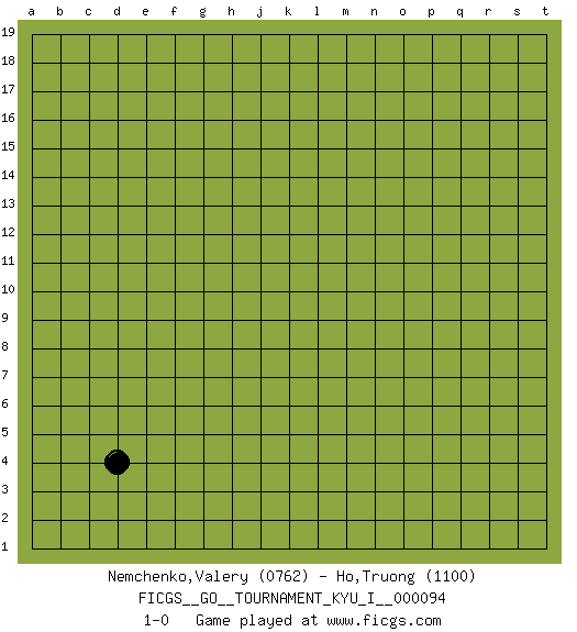 Last move : 1-0 2020 May 20 19:44:23 [Event "FICGS__GO__TOURNAMENT_KYU_I__000094"] [Site "FICGS"] [Date "2020.04.19"] [Round "1"] [Black "Nemchenko,Valery"] [White "Ho,Truong"] [Result "1-0"] [Rating 1 "0762"] [Rating 2 "1100"] 1.d4 1-0 This go game has been lost on time (started : 2020.04.19 19:53:24) Here are the names of the openings (joseki) played in the four corners : Corner d4 : d4 1-0 Hoshi (Hwajeom, Seongjeom, Xingwei`) 4-4 Point. The star or hoshi (4-4) point, emphasizing influence at the potential expense of territory. Player Black won this Go (weiqi, baduk) game. Follow this game move after move (download)Stop on second, extend on third. (Anonymous) Internal peace cannot coexist with external war. (Don Groves)