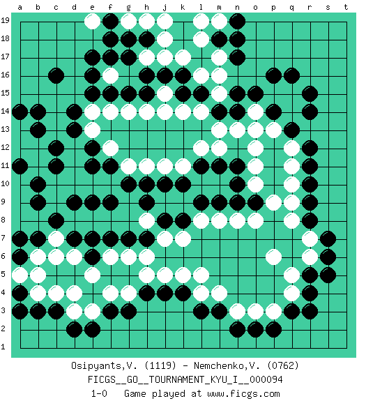 Last move : 1-0 2020 August 18 16:6:14 [Event "FICGS__GO__TOURNAMENT_KYU_I__000094"] [Site "FICGS"] [Date "2020.04.19"] [Round "1"] [Black "Osipyants,Vladimir"] [White "Nemchenko,Valery"] [Result "1-0"] [Rating 1 "1119"] [Rating 2 "0762"] 1.q16 d4 2.c16 q4 3.e17 f16 4.d13 d10 5.r14 q15 6.r15 q14 7.p16 p15 8.q13 p13 9.o15 o14 10.p14 o12 11.n14 o13 12.r10 q10 13.r11 q11 14.j16 j15 15.h15 h14 16.g15 g14 17.f15 f14 18.e15 e14 19.d14 e13 20.k15 j14 21.l15 k14 22.k4 k5 23.m3 l5 24.j4 j5 25.k10 k11 26.h10 j11 27.j10 h11 28.h7 j7 29.j8 k7 30.k8 l8 31.l9 m8 32.f3 f4 33.g3 g4 34.d2 e3 35.e2 d3 36.c3 c4 37.b3 b4 38.a4 a5 39.a3 b6 40.f9 g11 41.e7 h6 42.g7 g6 43.c8 f10 44.e9 e10 45.r8 q9 46.r9 q8 47.r3 q5 48.q3 p3 49.p2 o3 50.o2 n3 51.n2 m4 52.l3 l4 53.h4 h5 54.c11 c10 55.d9 b11 56.c12 b12 57.b13 a13 58.a14 a12 59.b14 c9 60.b10 a10 61.a11 a9 62.b9 a8 63.a7 b8 64.b7 c6 65.s5 r6 66.s6 r7 67.s7 q12 68.r12 n13 69.m14 m13 70.n10 l14 71.n9 n8 72.o9 o8 73.r4 p9 74.l11 l12 75.m11 m12 76.g10 d11 77.e12 d12 78.f11 f12 79.e11 d6 80.a6 b5 81.e6 e5 82.d7 f6 83.f7 c7 84.m9 o10 85.n11 o11 86.pass h8 87.h9 m15 88.n15 m16 89.k16 l16 90.h16 k17 91.n17 m17 92.h18 j17 93.m18 l18 94.n18 h17 95.g17 j18 96.g18 h19 97.f17 g19 98.f19 j19 99.e16 e19 100.f18 m19 101.n19 l19 102.r5 p6 103.pass 1-0 Here are the names of the openings (joseki) played in the four corners : Corner q4 : q4 m3 Hoshi (Hwajeom, Seongjeom, Xingwei`) 4-4 Point. The star or hoshi (4-4) point, emphasizing influence at the potential expense of territory. Corner d4 : d4 j4 Hoshi (Hwajeom, Seongjeom, Xingwei`) 4-4 Point. The star or hoshi (4-4) point, emphasizing influence at the potential expense of territory. Player Black won this Go (weiqi, baduk) game. Follow this game move after move (download)Keep sente in the opening. A premature attack loses sente. (Anonymous) Art disturbs, science reassures. (Georges Braque, Le Jour et la Nuit)