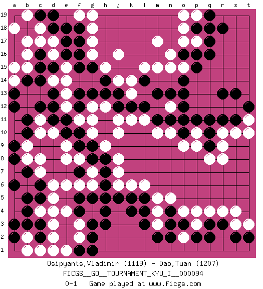 Last move : 0-1 2020 May 30 15:9:30 [Event "FICGS__GO__TOURNAMENT_KYU_I__000094"] [Site "FICGS"] [Date "2020.04.19"] [Round "1"] [Black "Osipyants,Vladimir"] [White "Dao,Tuan"] [Result "0-1"] [Rating 1 "1119"] [Rating 2 "1207"] 1.q16 d4 2.c16 q4 3.k4 m3 4.l3 m4 5.f4 d6 6.c3 d3 7.c2 d2 8.b5 b6 9.c5 d5 10.c6 c7 11.b7 b8 12.a6 c8 13.h3 c13 14.e16 g17 15.f17 g16 16.o16 d17 17.e17 d16 18.d15 c17 19.c15 e15 20.f15 e14 21.f16 b17 22.g15 j16 23.d13 d14 24.c14 e13 25.d12 e12 26.c12 b13 27.b14 b12 28.b11 c11 29.d11 c10 30.b10 d10 31.e11 f11 32.e10 e9 33.f10 g10 34.f9 f8 35.g9 h9 36.g8 g7 37.h8 j8 38.h7 g11 39.f7 e8 40.g13 g6 41.h6 h5 42.g5 f6 43.f5 e6 44.j5 m17 45.f12 j6 46.h4 j7 47.h5 j10 48.q10 r8 49.r13 p9 50.l5 m5 51.r3 r4 52.q3 s3 53.s2 s4 54.t2 p3 55.p2 o2 56.q2 o18 57.q17 m15 58.o13 p10 59.q11 l6 60.m13 n12 61.n13 l11 62.q9 q8 63.o11 n10 64.o12 s10 65.s11 r10 66.r11 t11 67.t12 t10 68.s13 r9 69.o10 o9 70.n11 m10 71.d18 c18 72.e18 b16 73.a13 b15 74.a12 a18 75.o3 p4 76.n2 o4 77.n3 q18 78.r18 p17 79.p16 g18 80.m2 h15 81.h14 j14 82.j13 k14 83.m11 n16 84.l12 k11 85.q19 o17 86.p18 o15 87.p15 g12 88.f13 h12 89.h13 c4 90.b4 f2 91.g2 b2 92.b3 c1 93.a2 b1 94.a8 b9 95.a9 f3 96.g3 o19 97.n4 n5 98.o14 n15 99.l14 l15 100.j12 j11 101.f1 k6 102.l4 p19 103.q18 e1 104.g1 e4 105.p11 a15 106.c19 b19 107.d19 k13 108.k12 f19 109.f18 t3 110.k5 g19 111.a3 d1 112.pass a14 0-1 Here are the names of the openings (joseki) played in the four corners : Corner d4 : d4 f4 Hoshi (Hwajeom, Seongjeom, Xingwei`) 4-4 Point. The star or hoshi (4-4) point, emphasizing influence at the potential expense of territory. Ikken Takagakari (Hankan Nop'dakeolch'im, Yi Gaojia, 1-Space High Approach). White typically responds at 6-4 or 3-10. White 4-10 is played when White finds play on the right side advantageous. White 4-8 or 3-8 may be played when White has support at top. Corner d16 : c16 c13 Komoku (Somok, Xiao~mu`) 3-4 Point. The komoku (3-4) point is the traditional corner enclosure move.. Player White won this Go (weiqi, baduk) game. Follow this game move after move (download)To invade, need 20 points in open area; otherwise, keshi is best. (Yang Yilun, 7p) You lose, general Kenobi. (General Grievous in Star Wars ep.3)