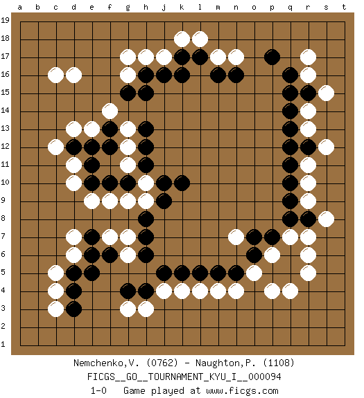 Last move : 1-0 2020 July 22 13:36:4 [Event "FICGS__GO__TOURNAMENT_KYU_I__000094"] [Site "FICGS"] [Date "2020.04.19"] [Round "1"] [Black "Nemchenko,Valery"] [White "Naughton,Patrick"] [Result "1-0"] [Rating 1 "0762"] [Rating 2 "1108"] 1.d4 q4 2.q16 d16 3.k10 g17 4.k16 m17 5.m16 n17 6.n16 k18 7.l17 l18 8.k17 j17 9.j16 h17 10.h16 r11 11.q11 r10 12.q10 r9 13.q9 r7 14.q8 k4 15.k5 l4 16.l5 m4 17.m5 h10 18.j10 h9 19.j9 e9 20.h8 d6 21.e5 n7 22.n5 q7 23.p7 r14 24.q14 r17 25.p17 r16 26.r15 s15 27.q15 r13 28.q13 g16 29.h15 c16 30.g15 d13 31.h11 g11 32.g10 g9 33.f10 f9 34.e10 d10 35.e11 d11 36.e12 e13 37.f12 c3 38.d3 c4 39.d5 c5 40.e6 d7 41.e7 g3 42.g4 h3 43.h4 j4 44.j5 g12 45.h12 g13 46.d12 c12 47.f13 f14 48.h13 o5 49.o6 n4 50.p5 p4 51.q5 r5 52.q6 r6 53.r8 s8 54.r12 s12 55.q12 p6 56.o7 g7 57.h7 f7 58.f6 g6 59.h6 1-0 Here are the names of the openings (joseki) played in the four corners : Corner q16 : q16 m17 Hoshi (Hwajeom, Seongjeom, Xingwei`) 4-4 Point. The star or hoshi (4-4) point, emphasizing influence at the potential expense of territory. Corner d4 : d4 h9 Hoshi (Hwajeom, Seongjeom, Xingwei`) 4-4 Point. The star or hoshi (4-4) point, emphasizing influence at the potential expense of territory. Player Black won this Go (weiqi, baduk) game. Follow this game move after move (download)Do not fear furikawari. (Anonymous) Locking firmely the window serves nothing, only small thiefs pass through there, the big thiefs enter through the front door. (Luc-Olivier Leclerc)