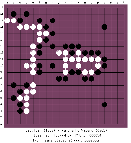 Last move : 1-0 2020 May 8 19:16:25 [Event "FICGS__GO__TOURNAMENT_KYU_I__000094"] [Site "FICGS"] [Date "2020.04.19"] [Round "1"] [Black "Dao,Tuan"] [White "Nemchenko,Valery"] [Result "1-0"] [Rating 1 "1207"] [Rating 2 "0762"] 1.q16 d4 2.q4 d16 3.f17 f16 4.g16 e16 5.h17 d10 6.q10 k10 7.g14 f15 8.h13 g15 9.h15 f14 10.f13 e13 11.f12 e12 12.f10 e11 13.h10 e10 14.f9 e9 15.c6 d6 16.d7 e6 17.b5 c5 18.c4 d5 19.b7 e7 20.c3 d3 21.c17 c16 22.d18 b17 23.b18 a17 24.k8 k11 25.l12 k12 26.k13 j12 27.l13 l11 28.m9 m11 29.n12 m12 30.m13 n11 31.o12 o11 32.p12 p11 33.q11 p10 34.p9 o9 35.o8 n9 36.n8 m10 37.l9 k9 38.j8 1-0 Here are the names of the openings (joseki) played in the four corners : Corner d16 : d16 f17 Hoshi (Hwajeom, Seongjeom, Xingwei`) 4-4 Point. The star or hoshi (4-4) point, emphasizing influence at the potential expense of territory. Ikken Kakari (Hankan Keolch'im, Yi Gua`jiao~, 1-Space Low Approach). Black 2 is the standard approach move to the 4-4. Corner d4 : d4 f9 Hoshi (Hwajeom, Seongjeom, Xingwei`) 4-4 Point. The star or hoshi (4-4) point, emphasizing influence at the potential expense of territory. Player Black won this Go (weiqi, baduk) game. Follow this game move after move (download)If you don't know ladders, don't play go. (Anonymous) Whenever people agree with me, I always feel I must be wrong. (Oscar Wilde)