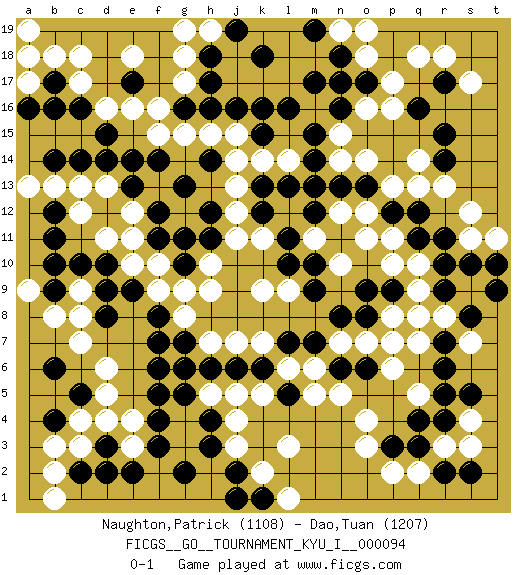 Last move : 0-1 2020 May 12 0:24:54 [Event "FICGS__GO__TOURNAMENT_KYU_I__000094"] [Site "FICGS"] [Date "2020.04.19"] [Round "1"] [Black "Naughton,Patrick"] [White "Dao,Tuan"] [Result "0-1"] [Rating 1 "1108"] [Rating 2 "1207"] 1.q16 d4 2.q4 d16 3.f3 j4 4.f5 d6 5.d2 c3 6.h4 j3 7.h3 o3 8.p3 o4 9.r6 j5 10.j2 k2 11.j1 l3 12.c14 c12 13.e14 f16 14.c10 e12 15.d12 d11 16.b12 d13 17.d14 b13 18.b11 c13 19.e13 c8 20.d10 e10 21.d8 c7 22.e9 f10 23.g13 f9 24.f8 g8 25.f7 g6 26.f6 h9 27.c2 b2 28.c5 d5 29.b4 b3 30.b9 b8 31.b6 c9 32.d9 a9 33.b10 b1 34.d3 c4 35.h16 h15 36.g16 g15 37.j16 f15 38.f12 j15 39.k16 j12 40.b14 a13 41.b16 c17 42.b17 b18 43.c16 c18 44.f11 e11 45.h12 j11 46.h11 h10 47.g11 m16 48.k15 j13 49.m15 n15 50.m14 n14 51.m13 q14 52.r14 r13 53.r15 q13 54.r10 q18 55.r17 r18 56.o17 p17 57.n16 p16 58.m17 s17 59.m9 o18 60.n18 o16 61.n17 r8 62.p9 p8 63.o8 p7 64.o9 o7 65.m7 n7 66.n8 m6 67.l7 r3 68.r4 p2 69.q3 q2 70.r2 s3 71.s2 s4 72.s5 g18 73.h18 g17 74.h17 h19 75.j19 g19 76.k18 e4 77.f4 l6 78.h6 h5 79.g7 h7 80.j6 j7 81.k6 k7 82.g5 k5 83.g6 l9 84.l10 k9 85.g10 g9 86.s8 s7 87.q8 q7 88.r7 q9 89.r9 q8 90.t9 q10 91.q11 p11 92.r11 p10 93.p12 m11 94.n11 n12 95.n13 o12 96.o13 p13 97.q12 o14 98.m12 o11 99.l11 n10 100.m10 l12 101.k12 k11 102.k13 k14 103.l13 s12 104.n6 n5 105.o6 p6 106.l5 m5 107.k1 l1 108.g2 e3 109.e2 s11 110.s10 t11 111.t10 q5 112.r5 n19 113.m19 o19 114.l16 a17 115.a18 a19 116.a16 a18 117.e17 e18 118.d15 e16 119.h14 j14 120.f14 l14 0-1 Here are the names of the openings (joseki) played in the four corners : Corner d4 : d4 f3 Hoshi (Hwajeom, Seongjeom, Xingwei`) 4-4 Point. The star or hoshi (4-4) point, emphasizing influence at the potential expense of territory. Ikken Kakari (Hankan Keolch'im, Yi Gua`jiao~, 1-Space Low Approach). Black 2 is the standard approach move to the 4-4. Corner q4 : q4 o3 Hoshi (Hwajeom, Seongjeom, Xingwei`) 4-4 Point. The star or hoshi (4-4) point, emphasizing influence at the potential expense of territory. Ikken Kakari (Hankan Keolch'im, Yi Gua`jiao~, 1-Space Low Approach). White 2 is the standard approach move to the 4-4. Corner d16 : d16 c14 Hoshi (Hwajeom, Seongjeom, Xingwei`) 4-4 Point. The star or hoshi (4-4) point, emphasizing influence at the potential expense of territory. Ikken Kakari (Hankan Keolch'im, Yi Gua`jiao~, 1-Space Low Approach). Black 2 is the standard approach move to the 4-4. Corner q16 : q16 m16 Hoshi (Hwajeom, Seongjeom, Xingwei`) 4-4 Point. The star or hoshi (4-4) point, emphasizing influence at the potential expense of territory. Player White won this Go (weiqi, baduk) game. Follow this game move after move (download)When your opponent has two weak groups, attack them both at once. (Anonymous) Now the reason the enlightened prince and the wise general conquer the enemy whenever they move and their achievements surpass those of ordinary men is foreknowledge. (Sun Tzu)