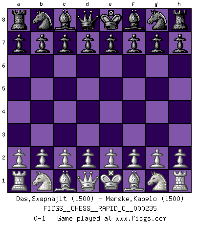 Last move : 0-1 2020 May 20 6:27:22 [Event "FICGS__CHESS__RAPID_C__000235"] [Site "FICGS"] [Date "2020.04.19"] [Round "1"] [White "Das,Swapnajit"] [Black "Marake,Kabelo"] [Result "0-1"] [WhiteElo "1500"] [BlackElo "1500"] 0-1 This chess game has been lost on time (started : 2020.04.19 20:52:7) Player Black won this chess game. Follow this game move after move (download)Chess is like life. (Boris Spassky) Das Zentrum ist der Balkan des Schachbretts - Kriegshandlungen können in jedem Moment ausbrechen. (Aaron Nimzowitsch) No hay precio que sea tan grande por la cabellera del Rey enemigo. (Koblentz) Nous sommes les pions de la mystérieuse partie d'Echecs jouée par Dieu. Il nous déplace, nous arrête, nous pousse encore, puis nous lance un à un dans la boîte du Néant. Epitaphe sur la tombe de David Janowsky (1868-1927). A computer lets you make more mistakes faster than any invention in human history - with the possible exceptions of handguns and tequila. (Mitch Ratcliffe)