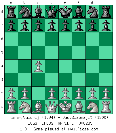 Last move : 1-0 2020 May 20 6:27:22 [Event "FICGS__CHESS__RAPID_C__000235"] [Site "FICGS"] [Date "2020.04.19"] [Round "1"] [White "Komar,Valerij"] [Black "Das,Swapnajit"] [Result "1-0"] [WhiteElo "1794"] [BlackElo "1500"] 1.c4 1-0 This chess game has been lost on time (started : 2020.04.19 20:52:7) English Opening Player White won this chess game. Follow this game move after move (download)Fischer is under obligation to nobody. (Joseph Platz) Ein bischen Romantik kann weder im Schach noch in der Liebe schaden. Also versuche ich mich ab und zu daran zu erinnern. (Nigel Short) Aquellos que dicen entender al Ajedrez, no entienden nada. (Robert Hubner) Mon pion favori sur ma case favorite ! Bronstein en parlant d'un coup de pion en h5 quand il avait les Noirs. Ah, the Socrating method. The best way we have of teaching everything-apart from juggling chainsaws. (Gregory House, House M.D.)