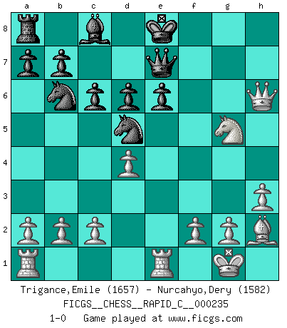 Last move : 1-0 2020 June 12 14:19:28 [Event "FICGS__CHESS__RAPID_C__000235"] [Site "FICGS"] [Date "2020.04.19"] [Round "1"] [White "Trigance,Emile"] [Black "Nurcahyo,Dery"] [Result "1-0"] [WhiteElo "1657"] [BlackElo "1582"] 1.e4 c6 2.d4 Nf6 3.Nc3 d6 4.Nf3 h6 5.h3 e6 6.Bd3 Be7 7.O-O Nbd7 8.Bf4 g5 9.Bh2 O-O 10.Qe2 Nb6 11.e5 Nfd5 12.Qe4 f5 13.exf6 Rxf6 14.Qh7+ Kf8 15.Bg6 Rxg6 16.Qxg6 Bf6 17.Ne4 Be7 18.Qxh6+ Ke8 19.Nfxg5 Bxg5 20.Nxg5 Qe7 21.Rfe1 1-0 Caro-Masi defense Kingside Castling by player White (move 7) Kingside Castling by player Black (move 9) Player White won this chess game. Follow this game move after move (download)Chess, like any creative activity, can exist only through the combined efforts of those who have creative talent, and those who have the ability to organize their creative work. (Mikhail Botvinnik) Kein Schachspieler kann gut schlafen. (H. G. Wells) No hay precio que no valga la pena por la cabellera del Rey enemigo. (Koblentz) La tactique, c'est ce que vous faites quand il y a quelque chose à faire; la stratégie, c'est ce que vous faites quand il n'y a rien à faire. (Savielli Tartacower) Horse racing is animated roulette. (Roger Kahn)