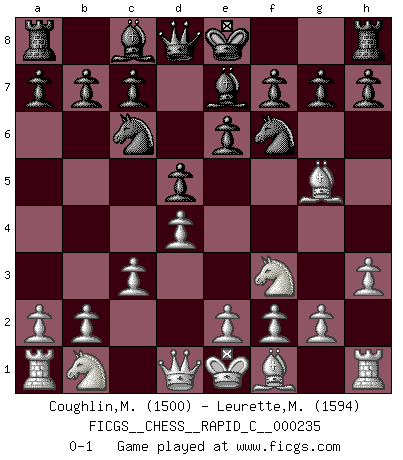 Last move : 0-1 2020 May 25 7:16:22 [Event "FICGS__CHESS__RAPID_C__000235"] [Site "FICGS"] [Date "2020.04.19"] [Round "1"] [White "Coughlin,Michael"] [Black "Leurette,Marc-Antoine"] [Result "0-1"] [WhiteElo "1500"] [BlackElo "1594"] 1.d4 d5 2.h3 Nc6 3.c3 Nf6 4.Nf3 e6 5.Bg5 Be7 0-1 This chess game has been lost on time (started : 2020.04.19 20:52:7) Queen's pawn game Player Black won this chess game. Follow this game move after move (download)The blunders are all there on the board, waiting to be made. (Savielly Tartakover) Ich hatte Zahnschmerzen im ersten Spiel. In der zweiten Partie tat mir der Kopf weh. In der dritten war es eine Rheuma-Attacke und während der vierten fühlte ich mich nicht gut. Und in der fünften? Nun, man muss doch nicht jedes Spiel gewinnen, oder? (Savielly Grigorievitsch Tartakower) No hay precio que sea tan grande por la cabellera del Rey enemigo. (Koblentz) Le génie consiste à savoir transgresser les règles au moment opportun. (Teichmann) Employ the attack like tactic of defense. (Chinese proverb)