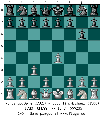 Last move : 1-0 2020 May 24 18:41:7 [Event "FICGS__CHESS__RAPID_C__000235"] [Site "FICGS"] [Date "2020.04.19"] [Round "1"] [White "Nurcahyo,Dery"] [Black "Coughlin,Michael"] [Result "1-0"] [WhiteElo "1582"] [BlackElo "1500"] 1.e4 g6 2.c3 1-0 This chess game has been lost on time (started : 2020.04.19 20:52:7) Robatsch (Modern) defense Player White won this chess game. Follow this game move after move (download)Discovered check is the dive bomber of the Chessboard. (Reuben Fine) Ich habe die besten Aussichten, den ersten Preis zu gewinnen - denn jeder muss gegen Steinitz spielen, nur ich nicht! (Wilhelm Steinitz) Bendita sea la memoria de aquel que dio al mundo este juego inmortal. (A. G. Gardiner) Les Cavaliers se révèlent fort utiles dans les positions fermées. D'habitude, les Fous sont un peu plus forts que les Cavaliers dans les positions ouvertes. Qu'on le veuille ou non, il restera toujours des exceptions ! Train yourself to let go of everything you fear to lose. (Master Yoda in Star Wars ep.3)