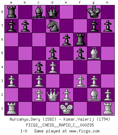 Last move : 1-0 2020 July 10 12:8:28 [Event "FICGS__CHESS__RAPID_C__000235"] [Site "FICGS"] [Date "2020.04.19"] [Round "1"] [White "Nurcahyo,Dery"] [Black "Komar,Valerij"] [Result "1-0"] [WhiteElo "1582"] [BlackElo "1794"] 1.g3 e6 2.d4 Nf6 3.Nc3 d5 4.Nf3 Nbd7 5.Bf4 Bb4 6.a3 Bxc3+ 7.bxc3 Ne4 8.Qd3 c5 9.Nd2 f5 10.f3 c4 11.Qe3 Nxd2 12.Qxd2 O-O 13.Bg2 Rf6 14.Bg5 1-0 This chess game has been lost on time (started : 2020.04.19 20:52:7) Benko's Opening Kingside Castling by player Black (move 12) Player White won this chess game. Follow this game move after move (download)After black's reply to 1.e4 with 1..e5, leaves him always trying to get into the game. (Howard Staunton) Kann Schach nicht schließlich das Nationalspiel der Deutschen werden? Und welche weiteren Ausblicke bieten sich dann dar! Welche Hebung des allgemeinen Kultur-Niveaus, ja der Moral, wenn das Schachbrett den Kartentisch verdrängen würde! Wahrlich, ein Ziel, des Schweißes der Edlen wert! (Siegbert Tarrasch) Una buena ofensiva y una buena defensa, comienzan ambas con un buen desarrollo. (Bruce A. Moon) La menace est plus forte que l'exécution. (Aaron Nimzovitch) Man is still the most extraordinary computer of all. (John F. Kennedy)