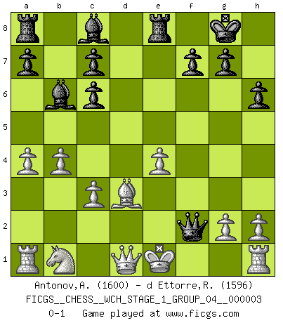 Last move : 0-1 2007 August 13 1:43:37 [Event "FICGS__CHESS__WCH_STAGE_1_GROUP_04__000003"] [Site "FICGS"] [Date "2007.07.11"] [Round "1"] [White "Antonov,Andrei"] [Black "d Ettorre,Rodolfo"] [Result "0-1"] [WhiteElo "1600"] [BlackElo "1596"] 1.e4 e5 2.Nf3 Nc6 3.d4 exd4 4.Nxd4 Nf6 5.Nxc6 bxc6 6.f3 Bc5 7.a3 d5 8.Bg5 h6 9.Bxf6 Qxf6 10.c3 O-O 11.b4 Bb6 12.Bd3 Re8 13.a4 dxe4 14.fxe4 Qf2+ 0-1 Scotch : Schmidt variation Kingside Castling by player Black (move 10) Player Black won this chess game. Follow this game move after move (download)There's never before been a Chess player with such a thorough knowledge of the intricacies of the game and such an absolutely indomitable will to win. I think Bobby is the greatest player that ever lived. (Lisa Lane) Ich habe Kasparov in Rente geschickt. (Veselin Topalov) Uno no tiene que jugar muy bien, es suficiente jugar mejor que el oponente. (Siegbert Tarrasch) Le système Elo représente seulement une moyenne. Il est simplement un indicateur de votre stabilité. (Anatoli Karpov) The quality of decision is like the well-timed swoop of a falcon which enables it to strike and destroy its victim. (Sun Tzu)