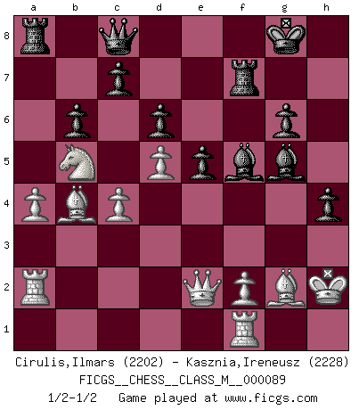 Last move : 1/2-1/2 2020 July 5 10:25:20 [Event "FICGS__CHESS__CLASS_M__000089"] [Site "FICGS"] [Date "2020.04.21"] [Round "1"] [White "Cirulis,Ilmars"] [Black "Kasznia,Ireneusz"] [Result "1/2-1/2"] [WhiteElo "2202"] [BlackElo "2228"] 1.c4 g6 2.d4 Nf6 3.Nc3 Bg7 4.e4 d6 5.Nf3 O-O 6.Be2 e5 7.O-O Nc6 8.d5 Ne7 9.b4 Nh5 10.Re1 f5 11.a4 a5 12.bxa5 Rxa5 13.exf5 Nxf5 14.Bd3 b6 15.Ra2 Nh4 16.Nxh4 Qxh4 17.Bf1 Bd7 18.g3 Qd8 19.h3 Bf6 20.Bg2 Bg5 21.Ba3 Nf6 22.Qd3 Ra8 23.Bb4 Qc8 24.Kh2 Bf5 25.Qe2 h5 26.Rf1 Rf7 27.Nb5 h4 28.g4 Nxg4+ 29.hxg4 Bxg4 30.Qd3 Bf5 31.Qe2 Bg4 32.Qd3 Bf5 33.Qe2 1/2-1/2 English Opening Kingside Castling by player Black (move 5) Kingside Castling by player White (move 7) This chess game ended in a draw. Follow this game move after move (download)There is only one thing Fischer does in Chess without pleasure: to lose ! (Boris Spassky) Ich habe Putins Aufstieg an die Macht beobachtet und seine Politik, die demokratischen Institutionen meines Landes zu zerstören. (Garry Kasparov) Las Aperturas te enseñan aperturas. ¡Los Finales te enseñan Ajedrez!. (Stephan Gerzadowicz) Celui qui prend des risques peut perdre, celui qui n'en prend pas perd toujours. (Xavier Tartacover) It's not the will to win, but the will to prepare to win that makes the difference. (Bear Bryant)